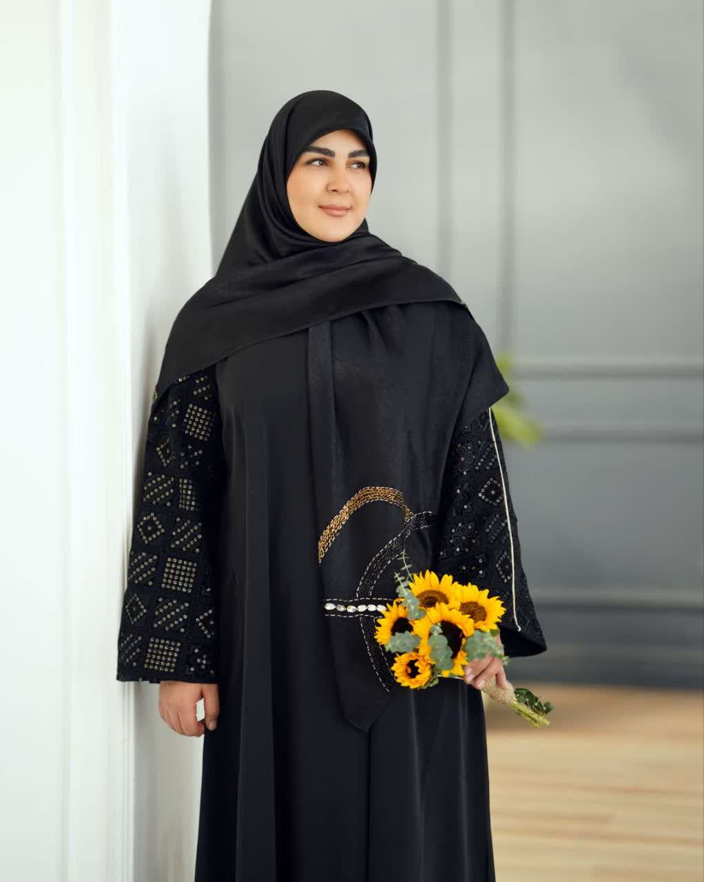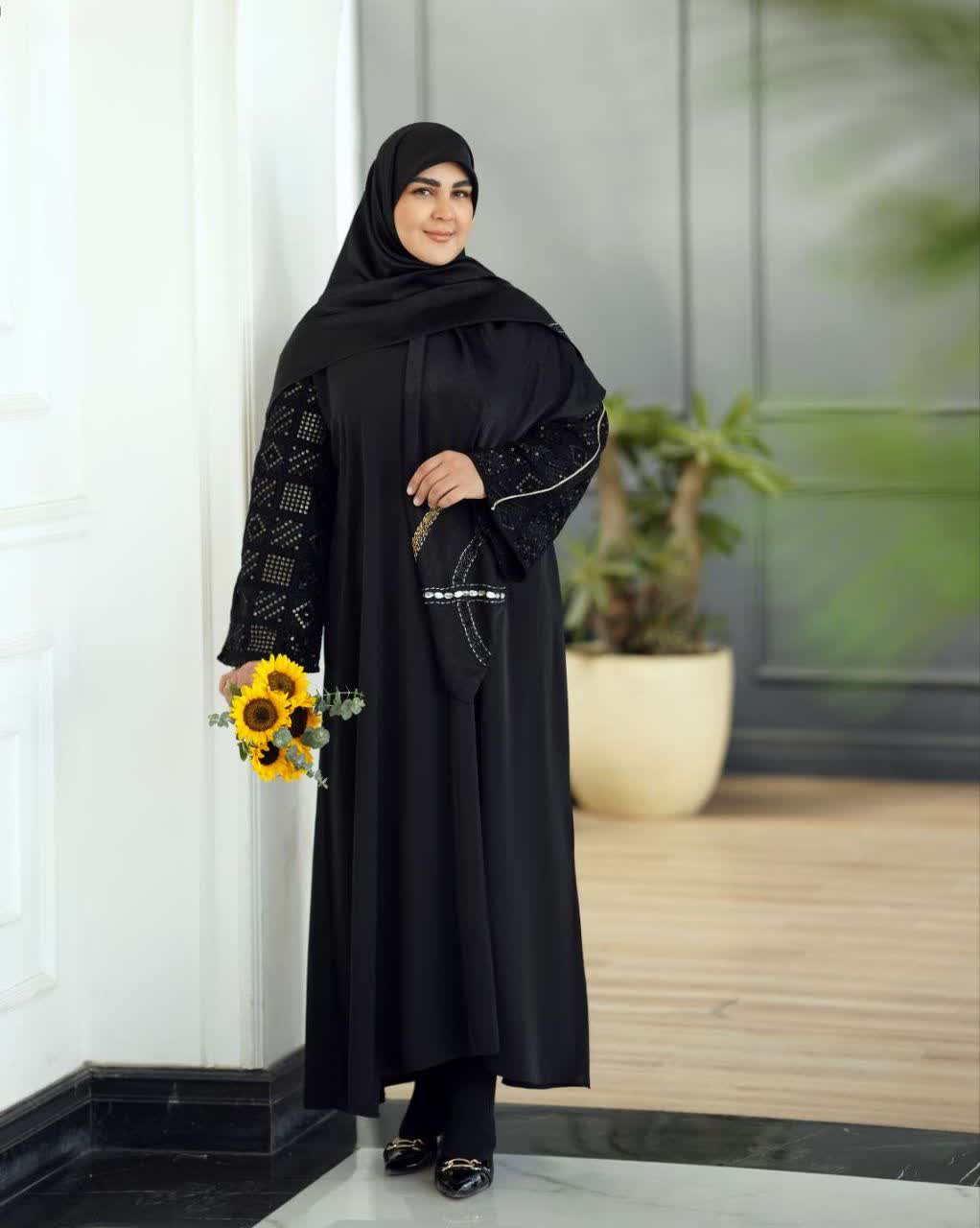 عبا خاتون جنس کرپ الیزه اعلا جلو بسته پشت تک دکمه و بندینک قواره کاملا آزاد پارچه لخت و ربزش دار فری سایز از 38 تا 54 بعلت برش و ریزش پارچه اصلا چاق نشونتون نمیده آستین مخمل سوزندوزی اعلا قد کار حدودا 145